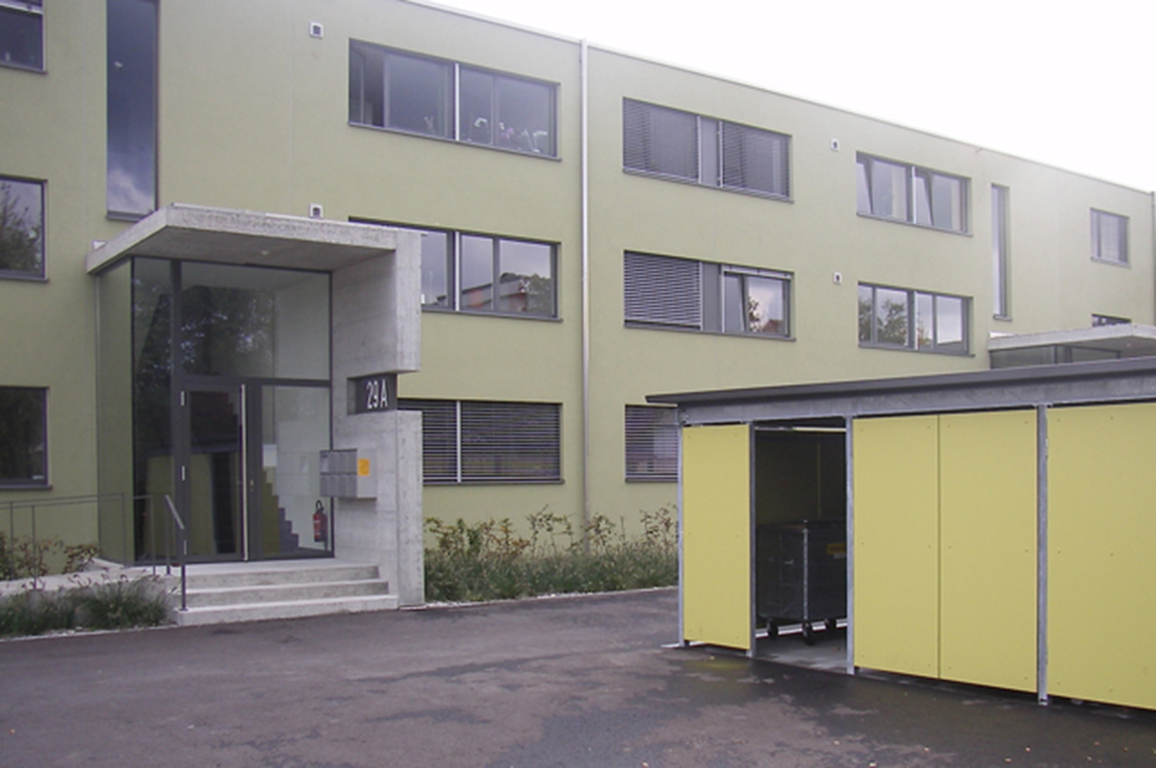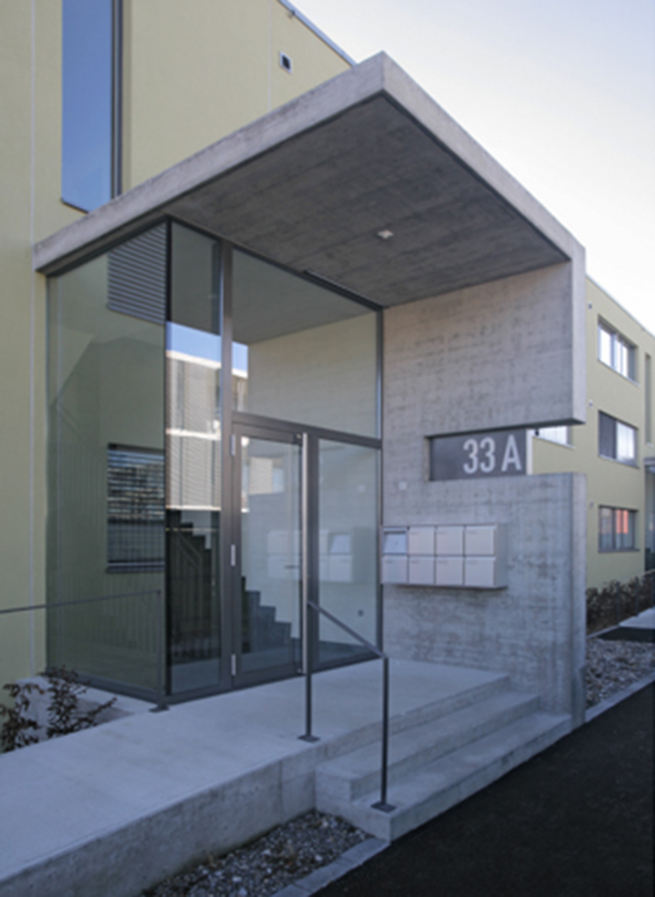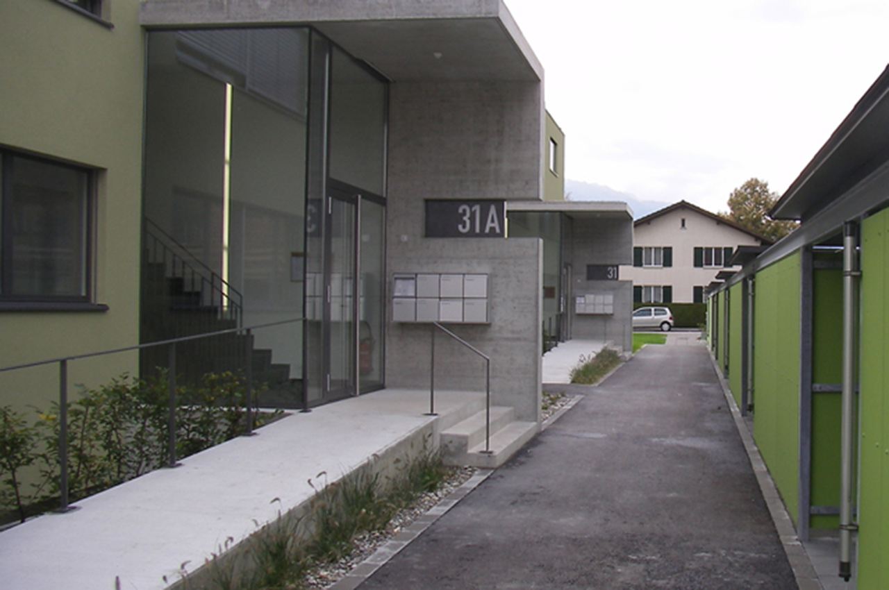 Auf einem ehemaligen Bauerngut sind neun Zeilenbauten entstanden. Diese strukturieren den Aussenraum und gewähren Durchblicke auf das historische Bauernhaus und die Berge. Die Gebäudehüllen sind verputzt, die Nebenbauten und Balkonschränke in Holz gearbeitet. Zwischen den Häuserzeilen sind die Bauten für Velo und Garten platziert.
