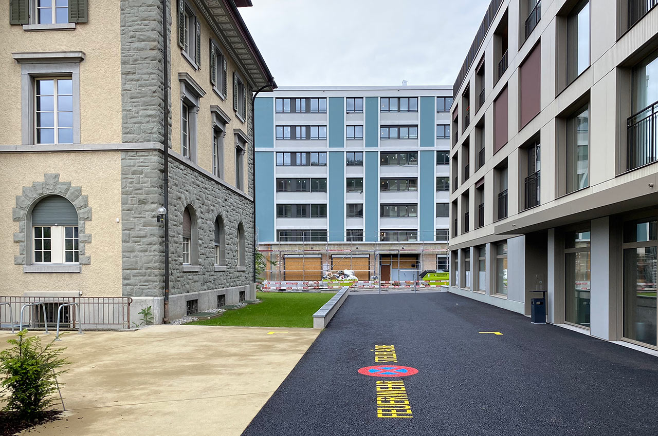 Aufgabe: Farbkonzept Gebäudehülle, Treppenhaus, Einstellhalle, Signaletik