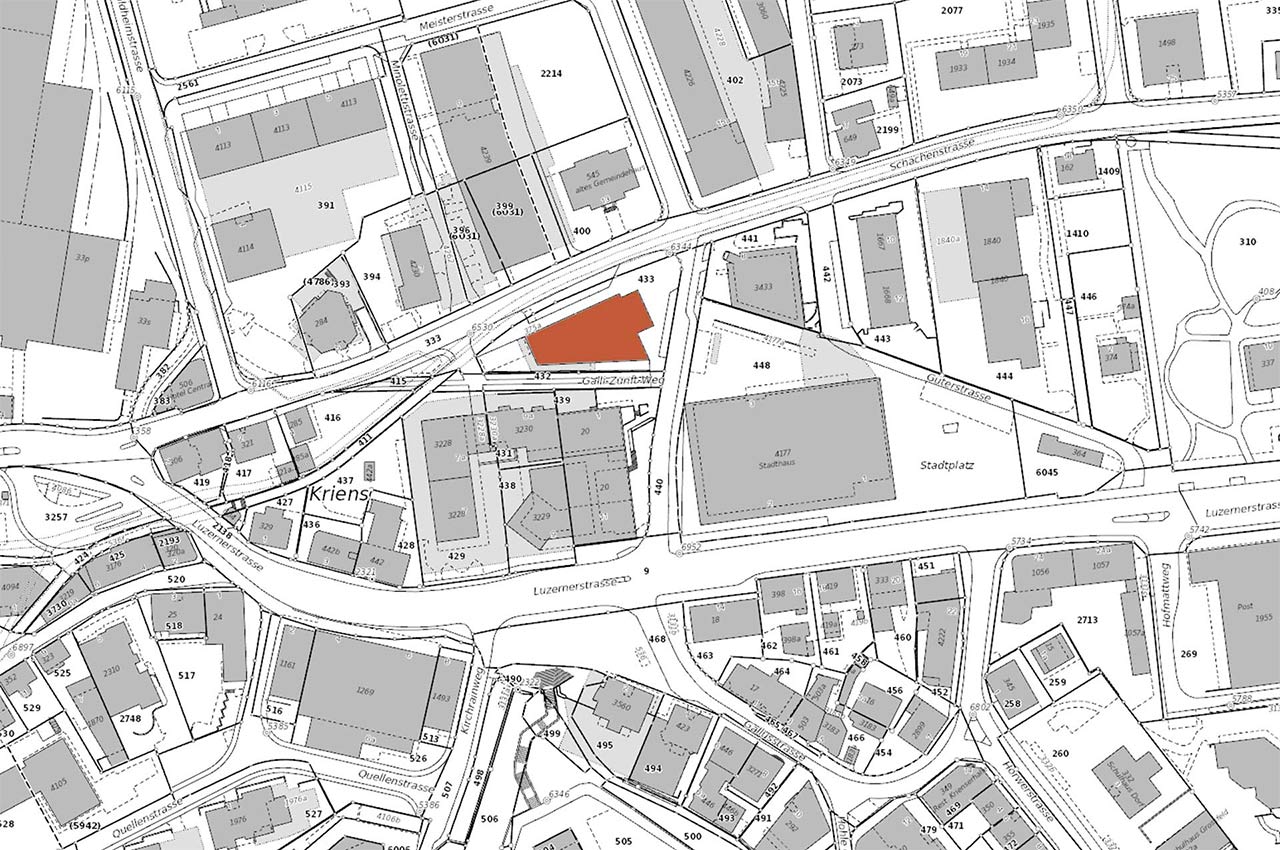 Das Wohn-und Geschäftshaus im Krienser Stadtkern wurde energetisch saniert und um ein Stockwerk erweitert. Ein liegendes Volumen bildet das Sockelgeschoss mit polygonalem Grundriss und nimmt die Bankfiliale in sich auf, die 2,5-5,5 Zimmer-Wohnungen verteilen sich im stehenden Volumen auf 6 Geschossen. Charakteristisch wirkt die Staffelung der Balkonschicht, während die üblichen Fassaden durch eine rigide Ordnung, der die Tektonik abbildenden Gliederungselemente, geprägt sind. Leicht zurückversetzte Kassetten im Fassadenraster bilden flächige Module, die eine deutliche Vertikalität und Rhythmisierung erzeugen.