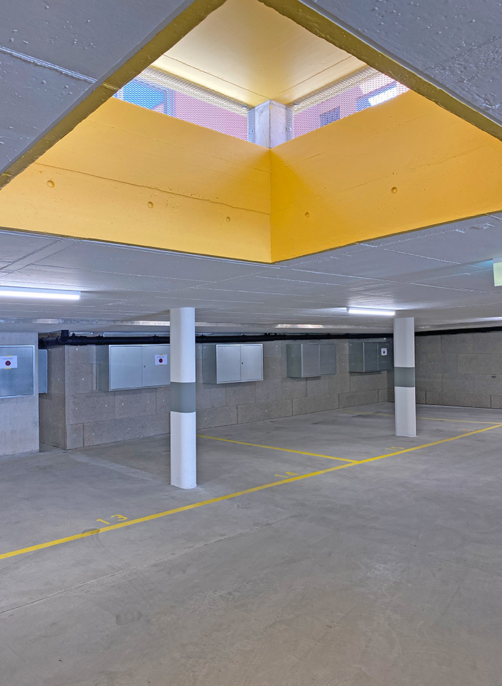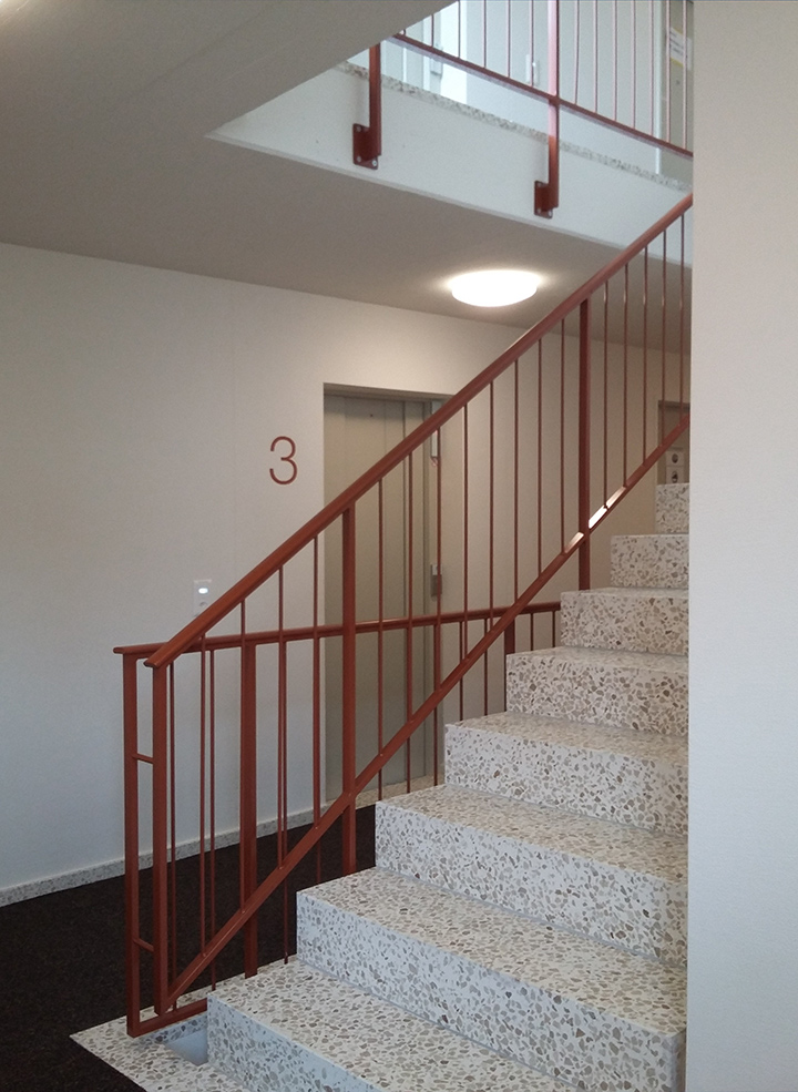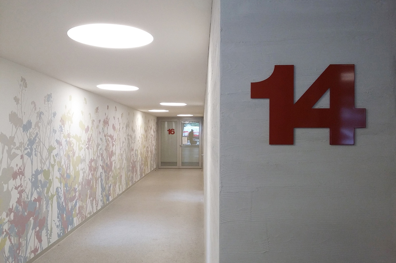 Drei lange Erschliessungskorridore wurden durch Terrazzoböden, Oblichter und Pflanzengrafiken aufgewertet, die Signaletik in Anlehnung an die Historie der Überbauung ausgebildet.